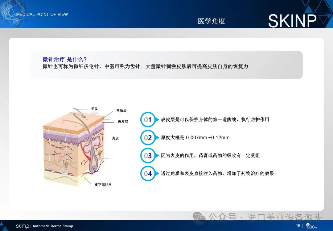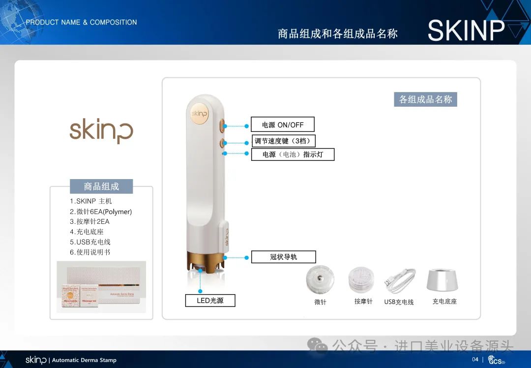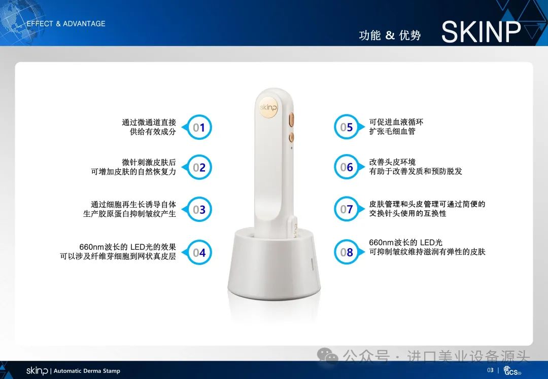 01 | 符合人体工学的握柄和高档的设计02 | 使用灭菌处理过的一次性针03 | 使用微针同时直接渗透有效成分04 | 使用660nm波长的红光 led05 | 连接主机和充电底座时可自动消毒06 | 精密的微针排列可以更均匀的触及到皮肤表面07 | 各阶段速度可调整(1~3阶段)08 | 短时间内可触及范围广缩短使用时间09 | 使用了齿轮式电动机垂直运作功率强且使用寿命长10 | 获得了诱导有效成分吸收领域的国际专利