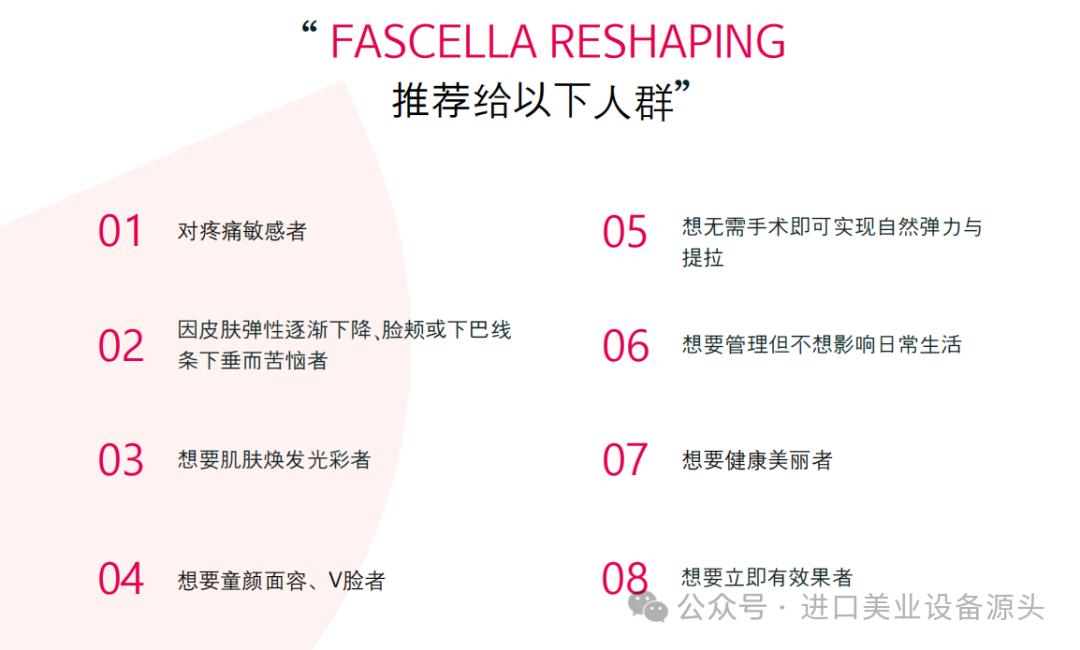 Q5. 有疼痛感吗?A5.与仅使用 MFR 器具带来疼痛的 IASTM技术不同,FASCELLA同时产生深部热能,可实现柔和、舒适的提拉与塑形。Q6.FASCELLA 可以使用在哪个部位?A6. 适用于需要改善皱纹及弹力、改善肤色、减少脂肪的所有部位(脸部及身体)。(魔法手套使用时请避开脸部和胸部。)Q7. 没有副作用吗?
